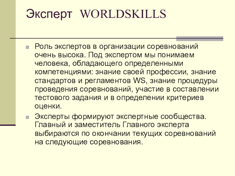 обладающего определенными компетенциями: знание своей профессии, знание стандартов и регламентов WS, знание процедуры проведения соревнований, участие в составлении тестового задания и в определении критериев оценки.