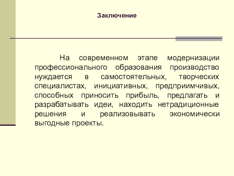 самостоятельных, творческих специалистах, инициативных, предприимчивых, способных приносить прибыль, предлагать и разрабатывать идеи, находить нетрадиционные решения и реализовывать экономически выгодные проекты.