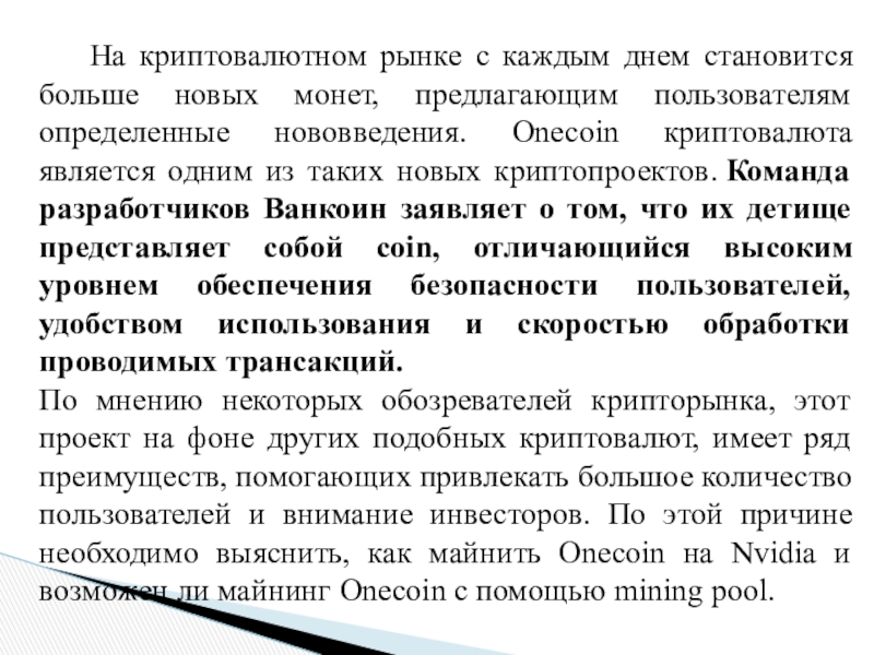 монет, предлагающим пользователям определенные нововведения. Onecoin криптовалюта является одним из таких новых криптопроектов. Команда разработчиков Ванкоин заявляет о том, что их детище представляет собой coin, отличающийся высоким уровнем обеспечения безопасности пользователей, удобством использования и скоростью обработки проводимых трансакций.