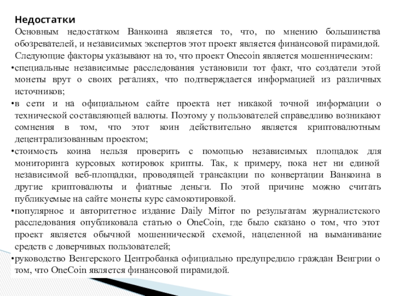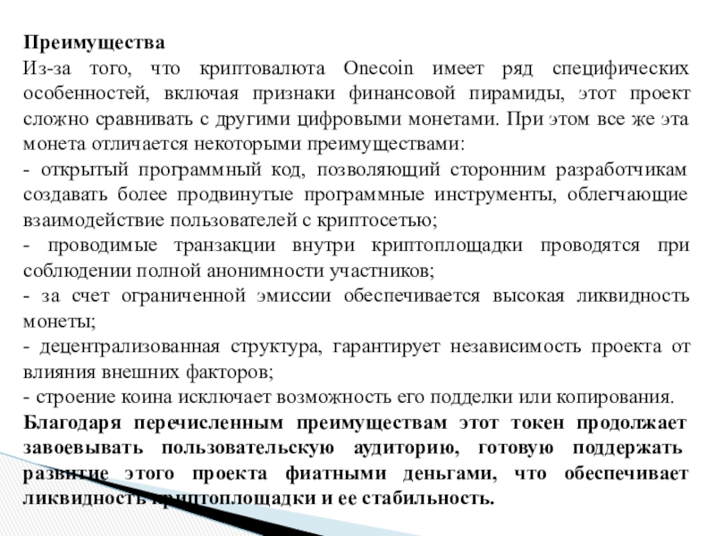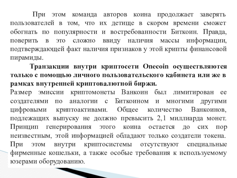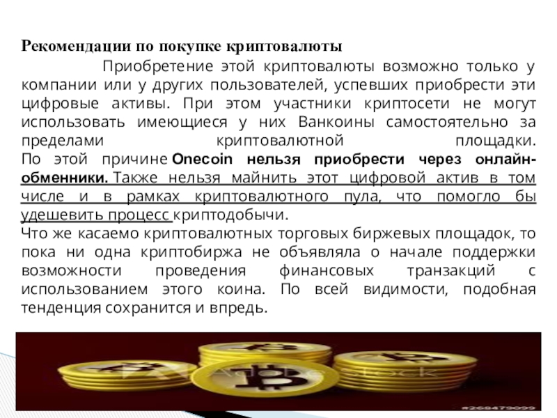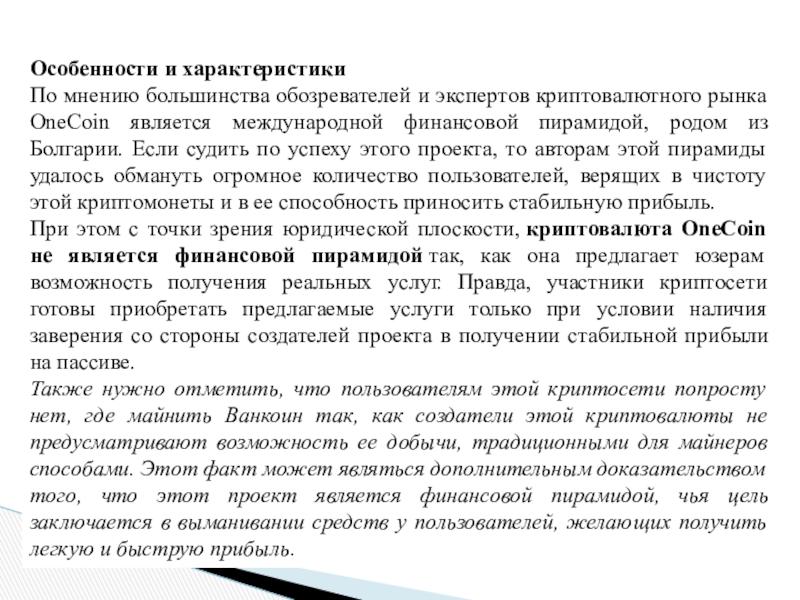 Из-за того, что криптовалюта Onecoin имеет ряд специфических особенностей, включая признаки