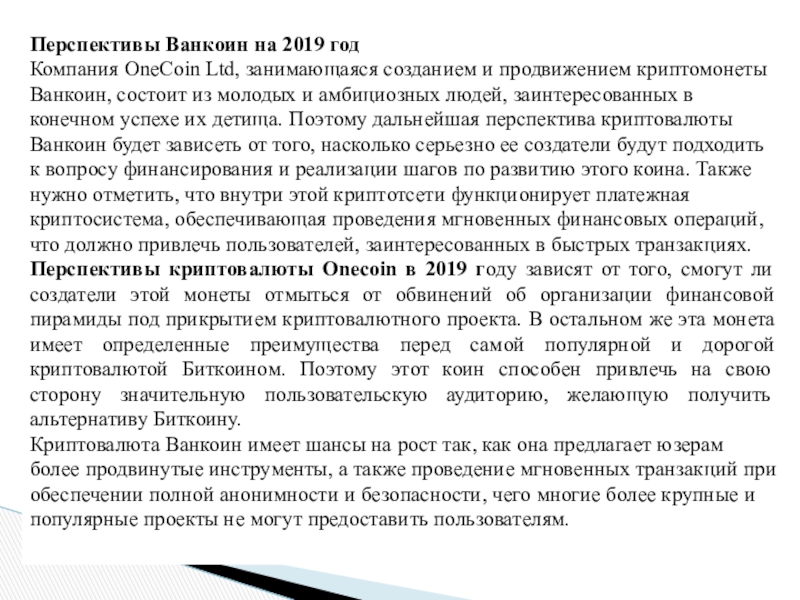 Слайд 13Перспективы Ванкоин на 2019 год