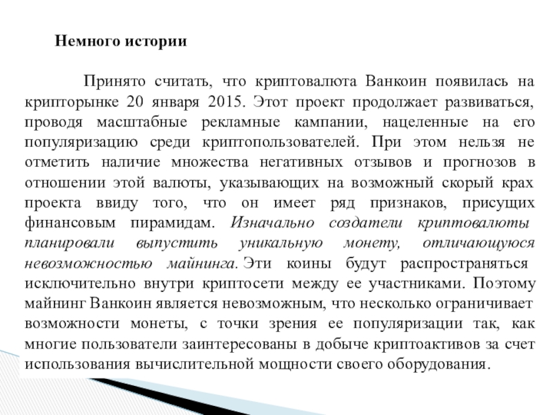 что криптовалюта Ванкоин появилась на крипторынке 20 января 2015. Этот проект продолжает развиваться, проводя масштабные рекламные кампании, нацеленные на его популяризацию среди криптопользователей. При этом нельзя не отметить наличие множества негативных отзывов и прогнозов в отношении этой валюты, указывающих на возможный скорый крах проекта ввиду того, что он имеет ряд признаков, присущих финансовым пирамидам. Изначально создатели криптовалюты планировали выпустить уникальную монету, отличающуюся невозможностью майнинга. Эти коины будут распространяться исключительно внутри криптосети между ее участниками. Поэтому майнинг Ванкоин является невозможным, что несколько ограничивает возможности монеты, с точки зрения ее популяризации так, как многие пользователи заинтересованы в добыче криптоактивов за счет использования вычислительной мощности своего оборудования.