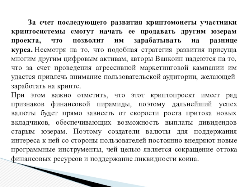 Даже если такая информация будет подтверждена все же подобные проекты способны приносить прибыль при грамотном инвестировании и своевременном выходе из пирамиды. Поэтому важно оценивать риски, а также учитывать рыночные факторы, способные оказать влияние на функционирование и последующий рост популярности криптоплощадки. Это связано с тем, что ликвидность Ванкоин напрямую зависит от поддержания роста пользовательской аудитории.