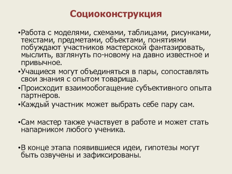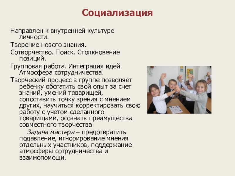 Задача мастера – предотвратить подавление, игнорирование мнения отдельных участников, поддержание атмосферы сотрудничества и взаимопомощи.