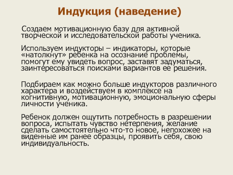 Подбираем как можно больше индукторов различного характера и воздействуем в комплексе на когнитивную, мотивационную, эмоциональную сферы личности ученика.
