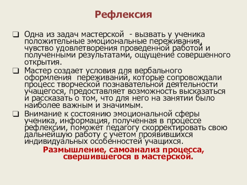 Мастер создает условия для вербального оформления переживаний, которые сопровождали процесс творческой познавательной деятельности учащегося, предоставляет возможность высказаться и рассказать о том, что для него на занятии было наиболее важным и значимым.