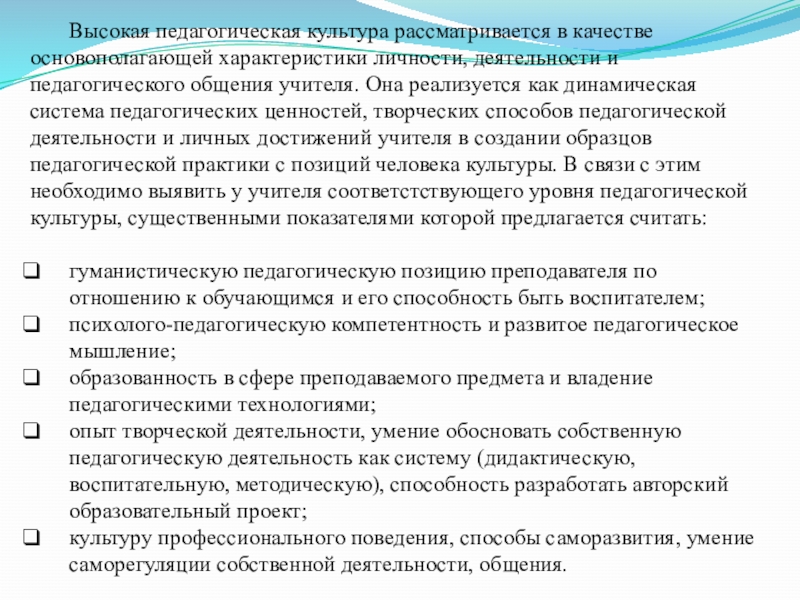 Слайд 9Высокая педагогическая культура рассматривается в качестве основополагающей характеристики личности, деятельности и