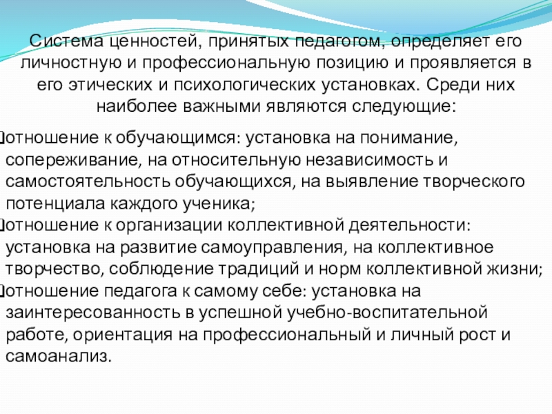 отношение педагога к самому себе: установка на заинтересованность в успешной учебно-воспитательной работе, ориентация на профессиональный и личный рост и самоанализ.