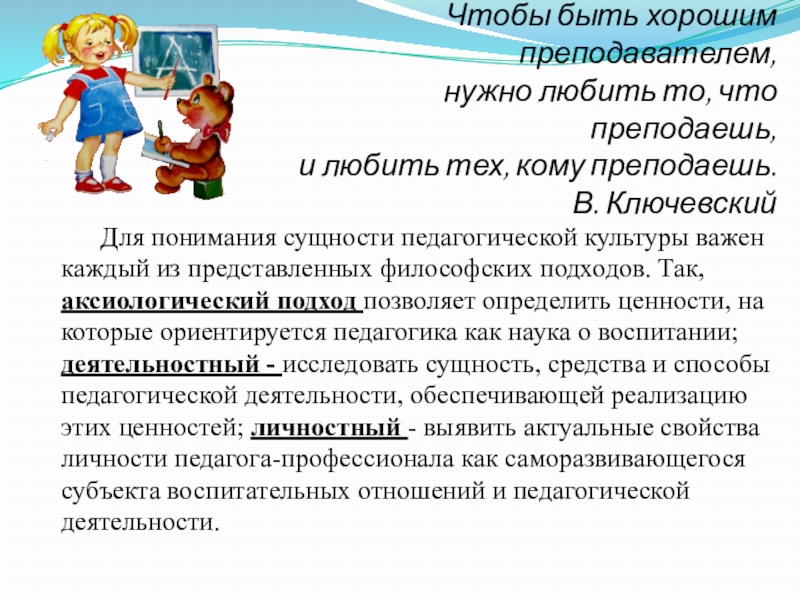 Для понимания сущности педагогической культуры важен каждый из представленных философских подходов. Так, аксиологический подход позволяет определить ценности, на которые ориентируется педагогика как наука о воспитании; деятельностный - исследовать сущность, средства и способы педагогической деятельности, обеспечивающей реализацию этих ценностей; личностный - выявить актуальные свойства личности педагога-профессионала как саморазвивающегося субъекта воспитательных отношений и педагогической деятельности.