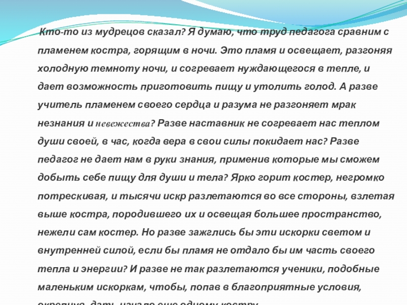 пламенем костра, горящим в ночи. Это пламя и освещает, разгоняя холодную темноту ночи, и согревает нуждающегося в тепле, и дает возможность приготовить пищу и утолить голод. А разве учитель пламенем своего сердца и разума не разгоняет мрак незнания и невежества? Разве наставник не согревает нас теплом души своей, в час, когда вера в свои силы покидает нас? Разве педагог не дает нам в руки знания, применив которые мы сможем добыть себе пищу для души и тела? Ярко горит костер, негромко потрескивая, и тысячи искр разлетаются во все стороны, взлетая выше костра, породившего их и освещая большее пространство, нежели сам костер. Но разве зажглись бы эти искорки светом и внутренней силой, если бы пламя не отдало бы им часть своего тепла и энергии? И разве не так разлетаются ученики, подобные маленьким искоркам, чтобы, попав в благоприятные условия, окрепнув, дать начало еще одному костру…