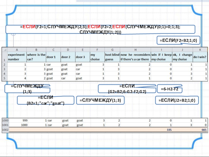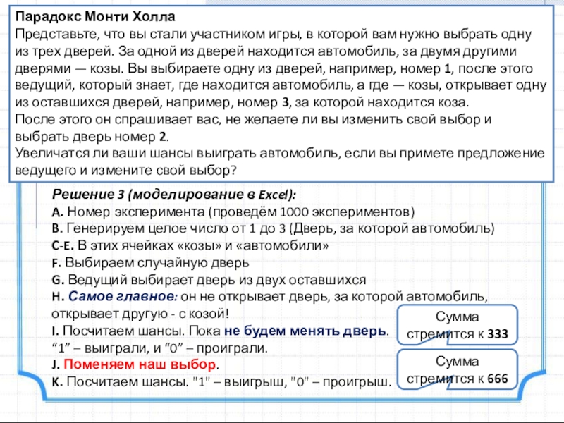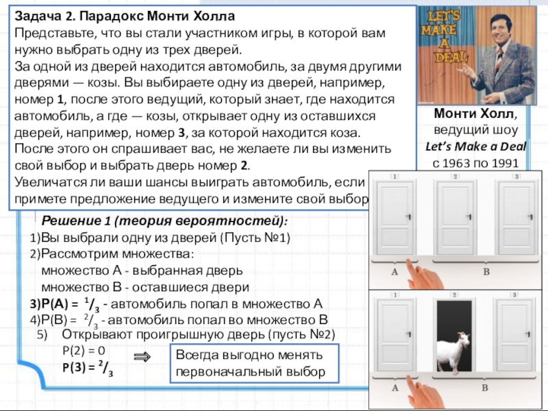 За одной из дверей находится автомобиль, за двумя другими дверями — козы. Вы выбираете одну из дверей, например, номер 1, после этого ведущий, который знает, где находится автомобиль, а где — козы, открывает одну из оставшихся дверей, например, номер 3, за которой находится коза.