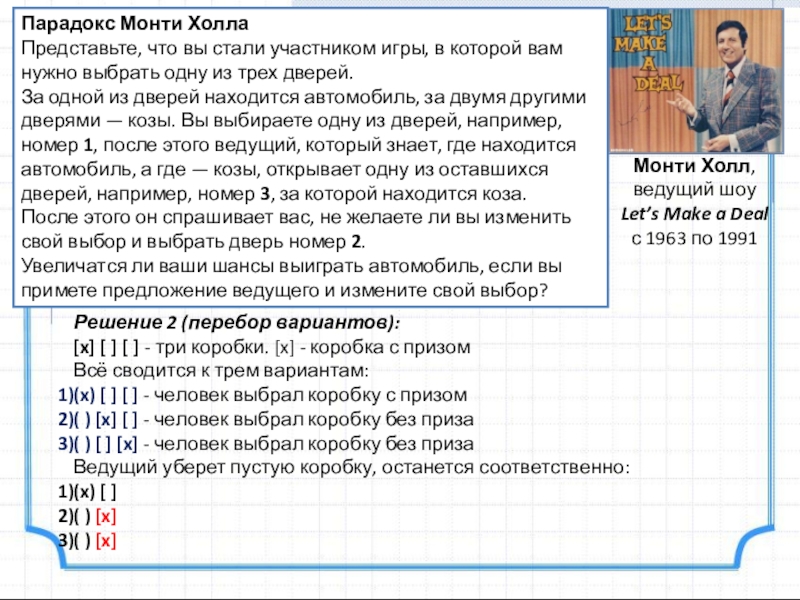 После этого он спрашивает вас, не желаете ли вы изменить свой выбор и выбрать дверь номер 2.
