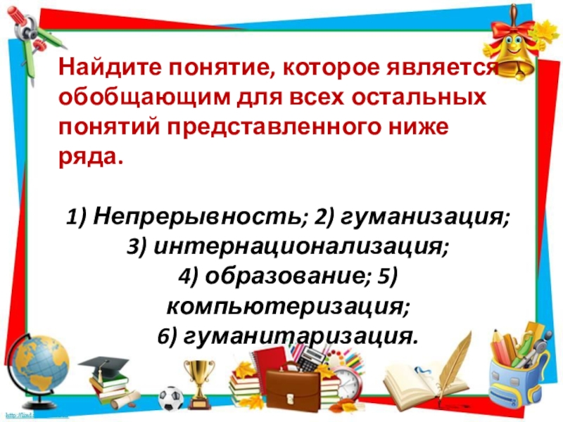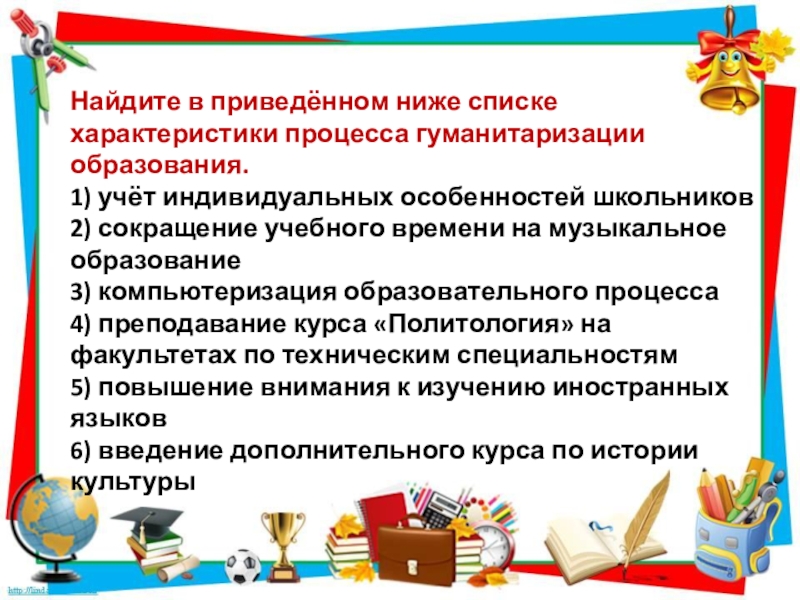 Слайд 17Найдите в приведённом ниже списке характеристики процесса гуманитаризации образования.