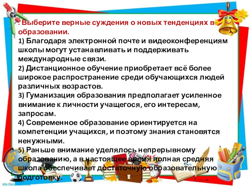 Слайд 14. Выберите верные суждения о новых тенденциях в образовании.