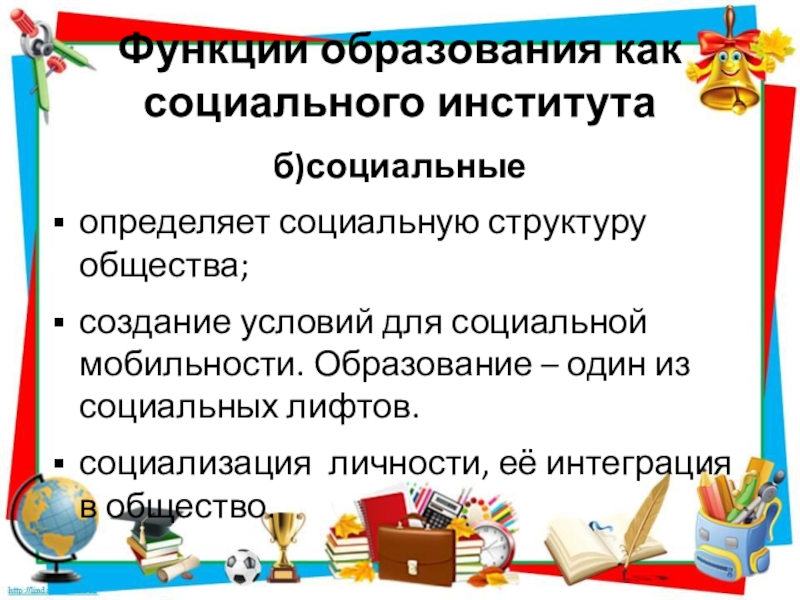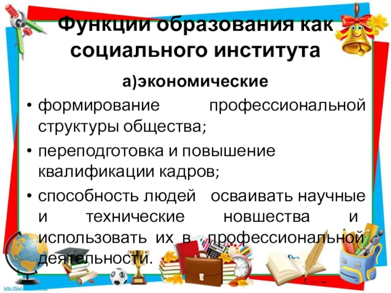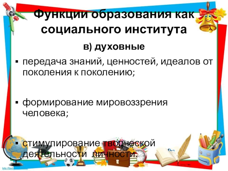 1) Система образования; 2) образовательные учреждения; 3) цели образования; 4) функции образования в обществе; 5) образовательные программы.