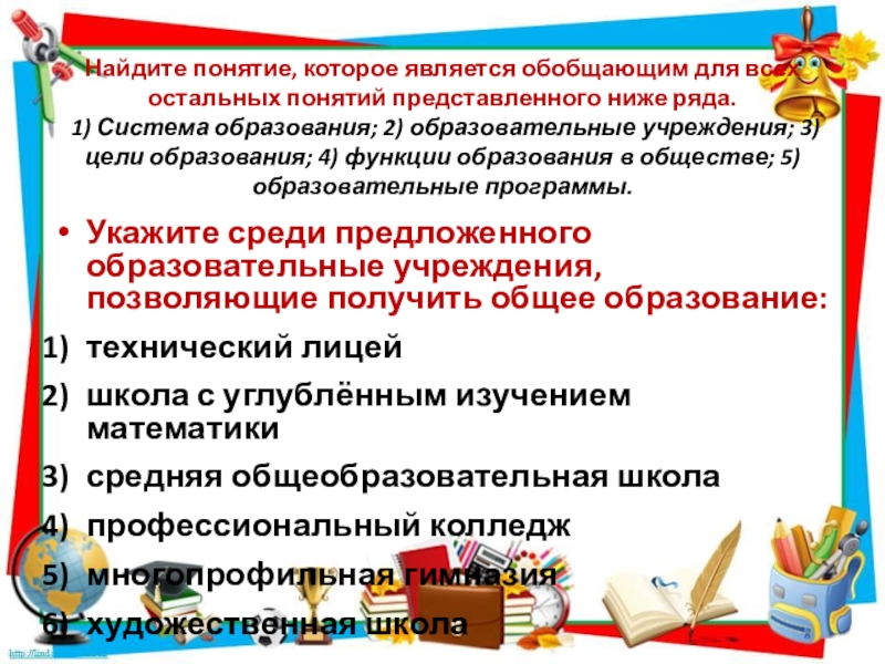 Укажите среди предложенного образовательные учреждения, позволяющие получить общее образование: