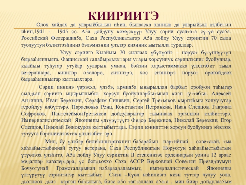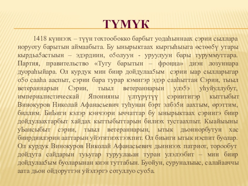 барытын аймаабыта. Бу ынырыктаах кыргыһыыга өстөө5ү утары кырдьа5астыын – эдэрдиин, о5олуун - уруулуун бары туруммуттара. Партия, правительство «Тугу барытын – фроӊӊа» диэн лозуннара дуораһыйара. Ол курдук мин биир дойдулаа5ым сэрии ыар сылларыгар о5о сааһа ааспыт, сэрии бара турар кэмигэр эдэр сааһыттан Сэрии, тыыл ветераннарын Сэрии, тыыл ветераннарын улэ5э уһуйуллубут, империалистическай Японияны үлтүрүтүү сэриитигэр кыттыбыт Винокуров Николай Афанасьевич туһунан бэрт элбэ5и аахтым, өрэттим, биллим. БиЬиги кэлэр кэнчээри ыччаттар бу ынырыктаах сэриигэ биир дойдулаахтарбыт хайдах кыттыбыттарын билиэх тустаахпыт. Кыайыыны уЬансыбыт сэрии, тыыл ветераннарын, ытык дьоннорбутун хас биирдиилэрин ааттарын уйэтитиэхтээхпит. Ол биьиги ытык иэспит буолар. Ол курдук Винокуров Николай Афанасьевич дьиннээх патриот, торообут дойдута сайдарын туьугар туруулаьан туран улэлээбит – мин биир дойдулаа5ым буоларынан киэн туттабын. Буойун, суруналыыс, салайааччы аата дьон ойдоруттэн уйэлэргэ сотуллуо суо5а.