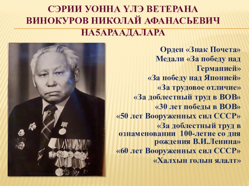 Слайд 5сЭрии уонна Үлэ ветерана Винокуров Николай Афанасьевич на5араадалара