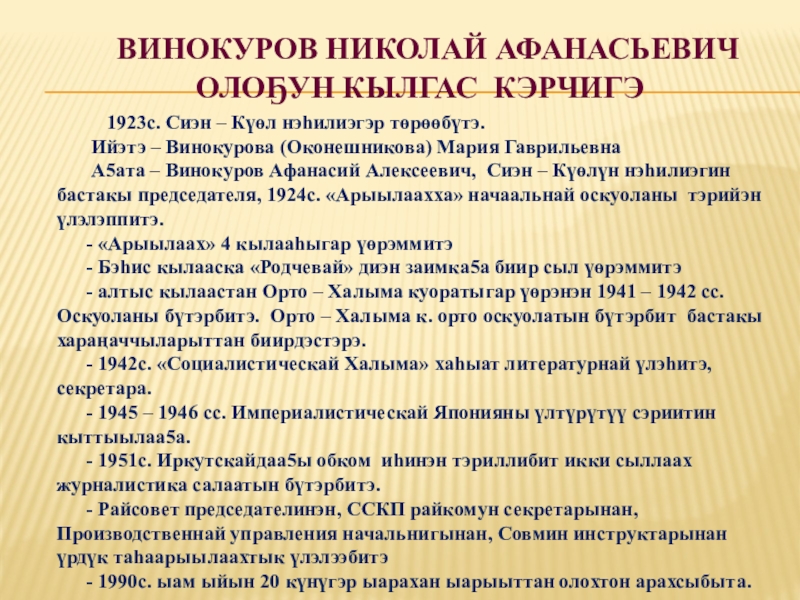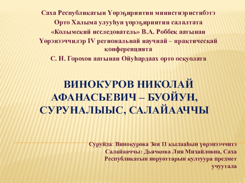 Слайд 1 Винокуров Николай Афанасьевич – буойун, суруналыыс, салайааччы