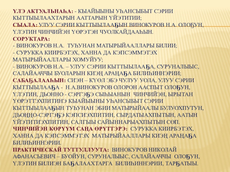- Винокуров Н.А. туһунан матырыйааллары билии;