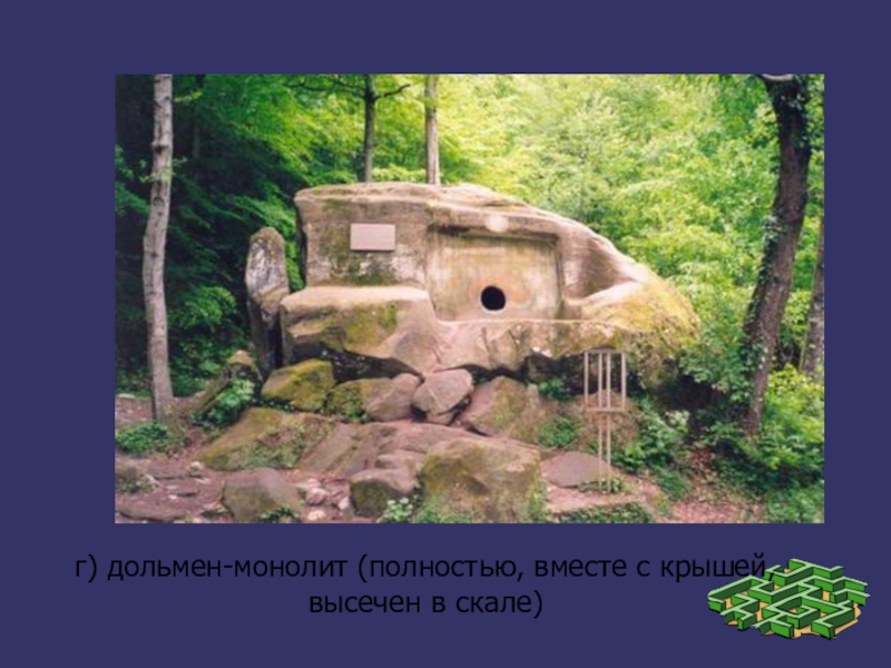 г) дольмен-монолит (полностью, вместе с крышей, высечен в скале)