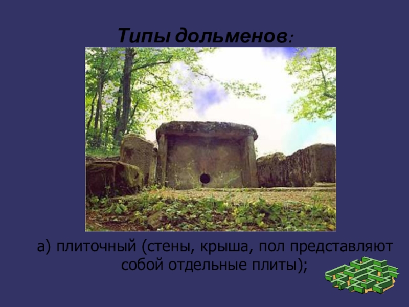 Типы дольменов:а) плиточный (стены, крыша, пол представляют собой отдельные плиты);
