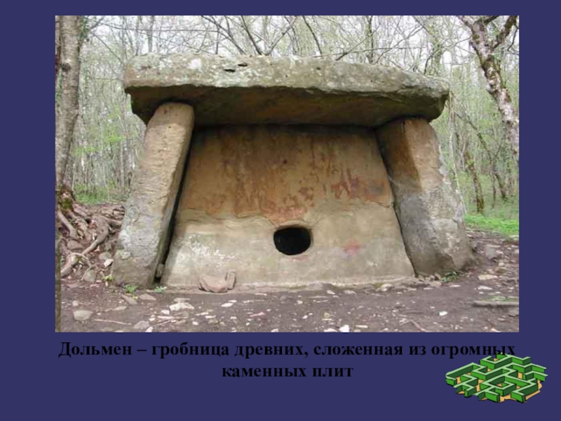 Слайд 4Дольмен – гробница древних, сложенная из огромных каменных плит
