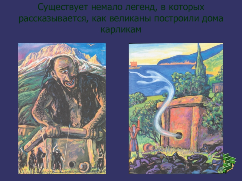 Слайд 2Существует немало легенд, в которых рассказывается, как великаны построили дома карликам