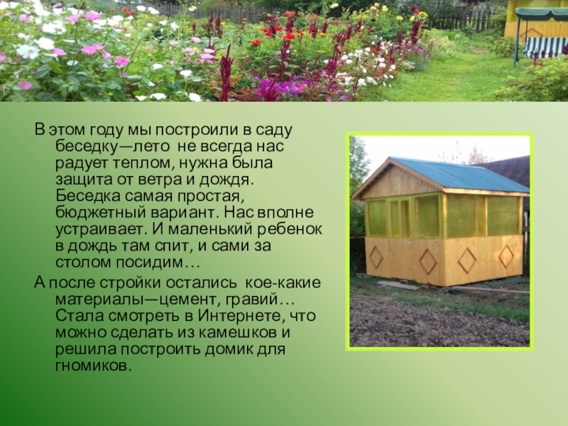 В этом году мы построили в саду беседку—лето не всегда нас