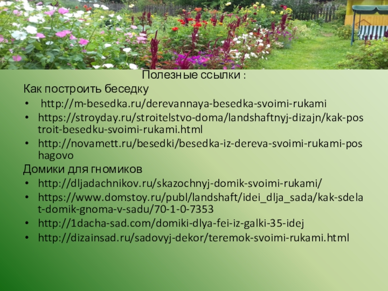 Полезные ссылки :Как построить беседку http://m-besedka.ru/derevannaya-besedka-svoimi-rukamihttps://stroyday.ru/stroitelstvo-doma/landshaftnyj-dizajn/kak-postroit-besedku-svoimi-rukami.htmlhttp://novamett.ru/besedki/besedka-iz-dereva-svoimi-rukami-poshagovoДомики для гномиковhttp://dljadachnikov.ru/skazochnyj-domik-svoimi-rukami/https://www.domstoy.ru/publ/landshaft/idei_dlja_sada/kak-sdelat-domik-gnoma-v-sadu/70-1-0-7353http://1dacha-sad.com/domiki-dlya-fei-iz-galki-35-idejhttp://dizainsad.ru/sadovyj-dekor/teremok-svoimi-rukami.html