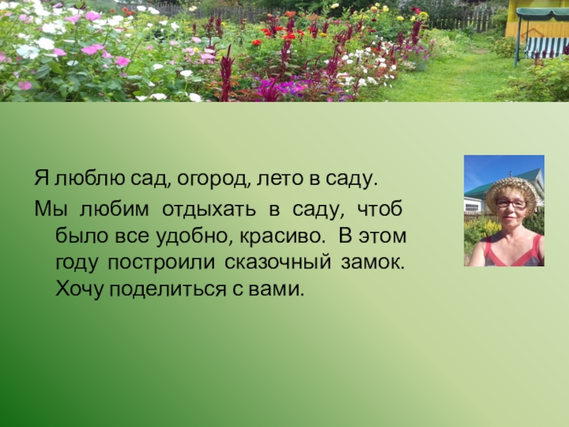 Я люблю сад, огород, лето в саду. Мы любим отдыхать в саду, чтоб было все удобно, красиво.