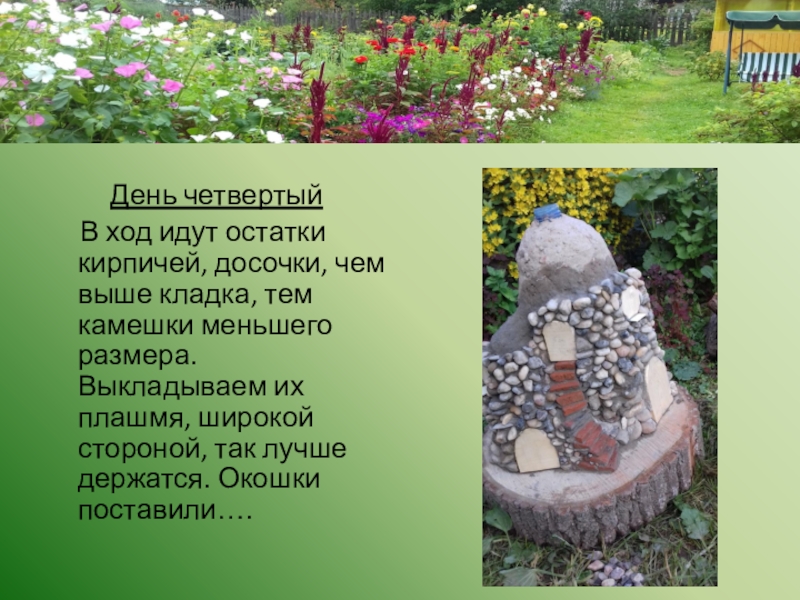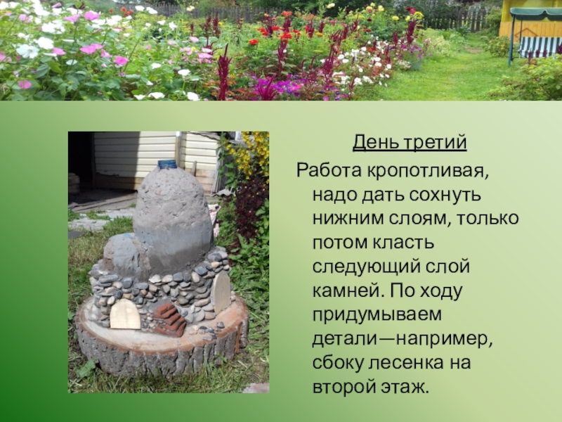 День третий Работа кропотливая, надо дать сохнуть нижним слоям, только потом класть следующий слой камней. По ходу придумываем