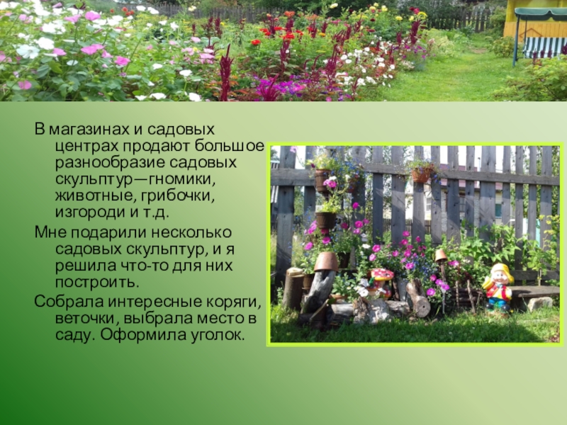 В магазинах и садовых центрах продают большое разнообразие садовых скульптур—гномики, животные, грибочки, изгороди и т.д. Мне подарили