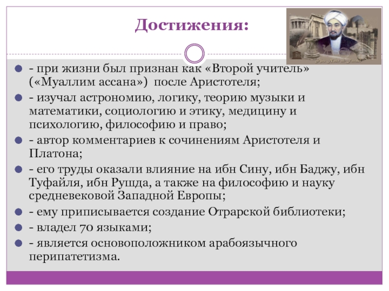 - является основоположником арабоязычного перипатетизма.