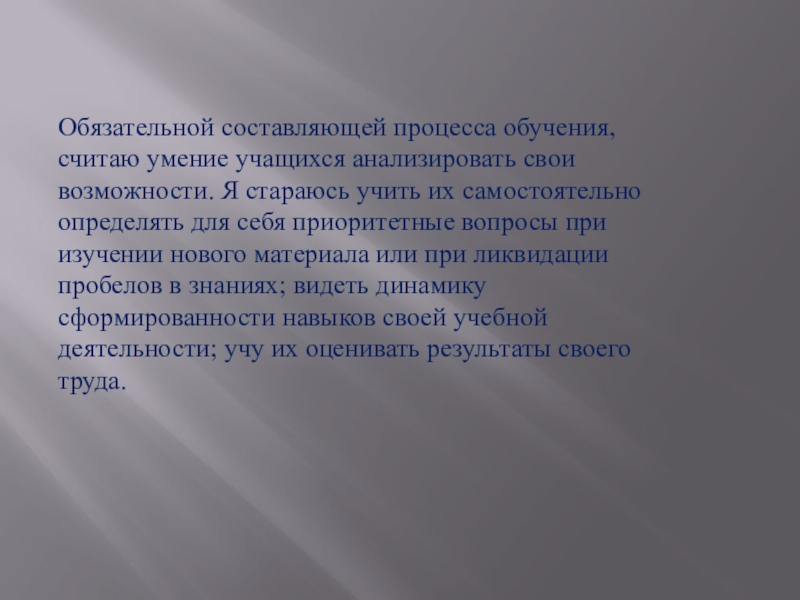 Слайд 25Обязательной составляющей процесса обучения, считаю умение учащихся анализировать свои возможности. Я