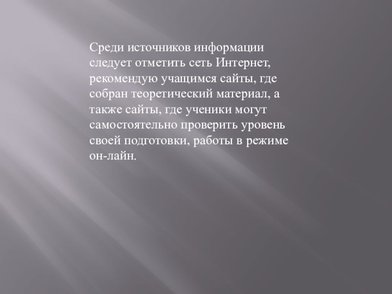 Слайд 8Среди источников информации следует отметить сеть Интернет, рекомендую учащимся сайты, где