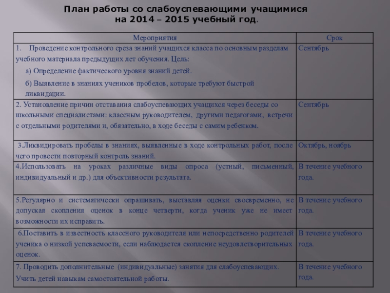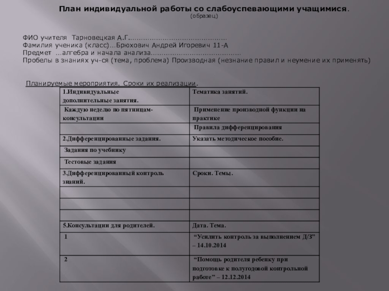 Слайд 22План индивидуальной работы со слабоуспевающими учащимися.