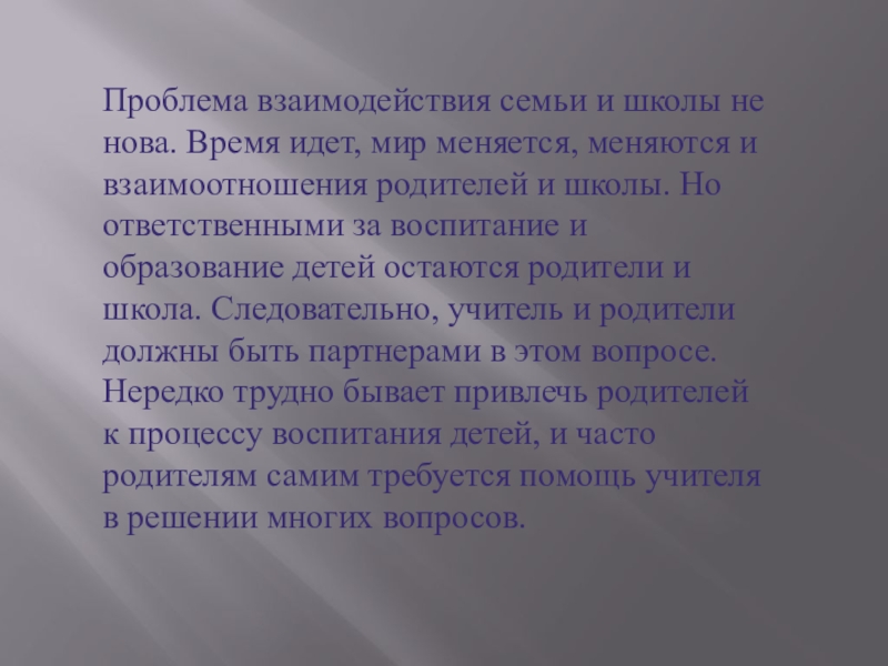 меняются и взаимоотношения родителей и школы. Но ответственными за воспитание и образование детей остаются родители и школа. Следовательно, учитель и родители должны быть партнерами в этом вопросе. Нередко трудно бывает привлечь родителей к процессу воспитания детей, и часто родителям самим требуется помощь учителя в решении многих вопросов.