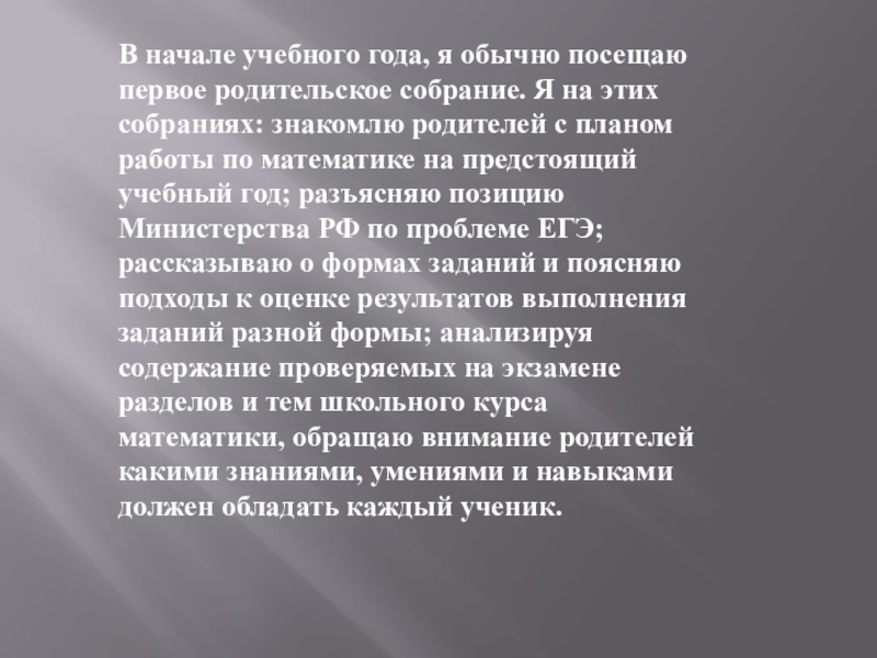 на этих собраниях: знакомлю родителей с планом работы по математике на предстоящий учебный год; разъясняю позицию Министерства РФ по проблеме ЕГЭ; рассказываю о формах заданий и поясняю подходы к оценке результатов выполнения заданий разной формы; анализируя содержание проверяемых на экзамене разделов и тем школьного курса математики, обращаю внимание родителей какими знаниями, умениями и навыками должен обладать каждый ученик.