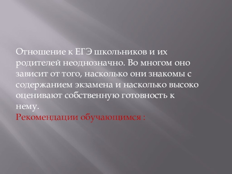 Слайд 14Отношение к ЕГЭ школьников и их родителей неоднозначно. Во многом оно