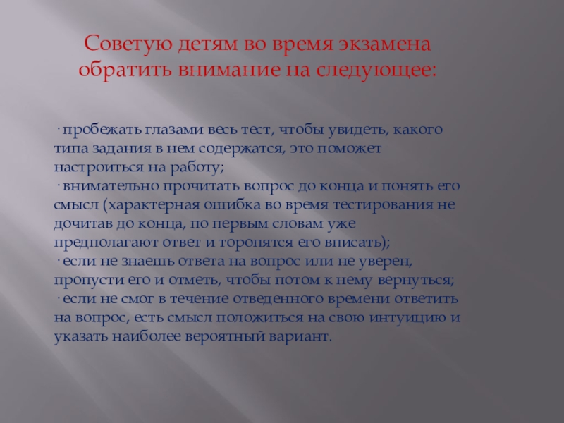 Слайд 26Советую детям во время экзамена обратить внимание на следующее: