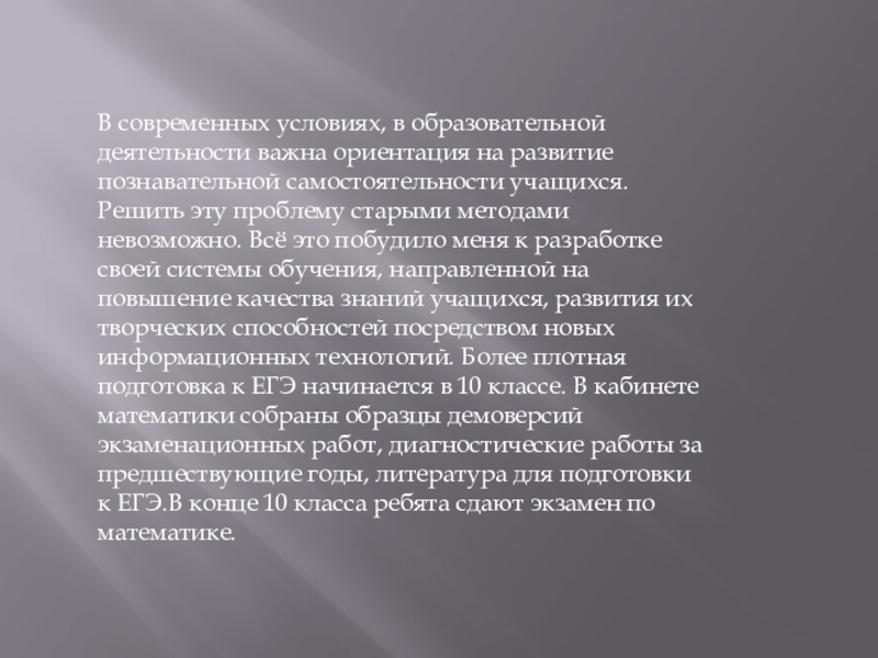 самостоятельности учащихся. Решить эту проблему старыми методами невозможно. Всё это побудило меня к разработке своей системы обучения, направленной на повышение качества знаний учащихся, развития их творческих способностей посредством новых информационных технологий. Более плотная подготовка к ЕГЭ начинается в 10 классе. В кабинете математики собраны образцы демоверсий экзаменационных работ, диагностические работы за предшествующие годы, литература для подготовки к ЕГЭ.В конце 10 класса ребята сдают экзамен по математике.