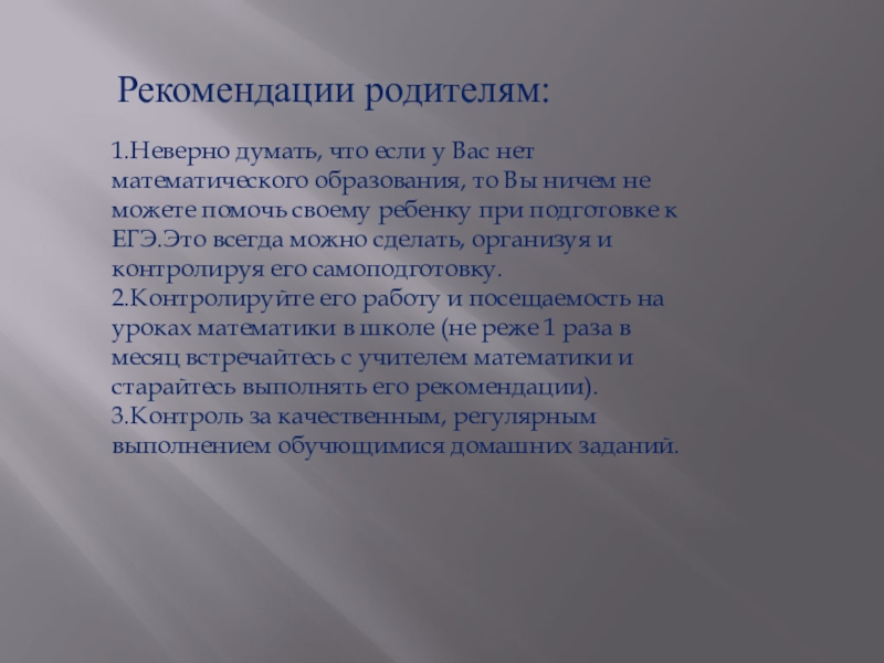 2.Контролируйте его работу и посещаемость на уроках математики в школе (не реже 1 раза в месяц встречайтесь с учителем математики и старайтесь выполнять его рекомендации).
