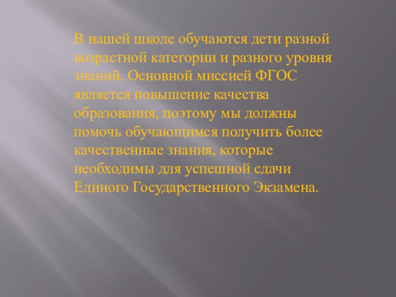 знаний. Основной миссией ФГОС является повышение качества образования, поэтому мы должны помочь обучающимся получить более качественные знания, которые необходимы для успешной сдачи Единого Государственного Экзамена.