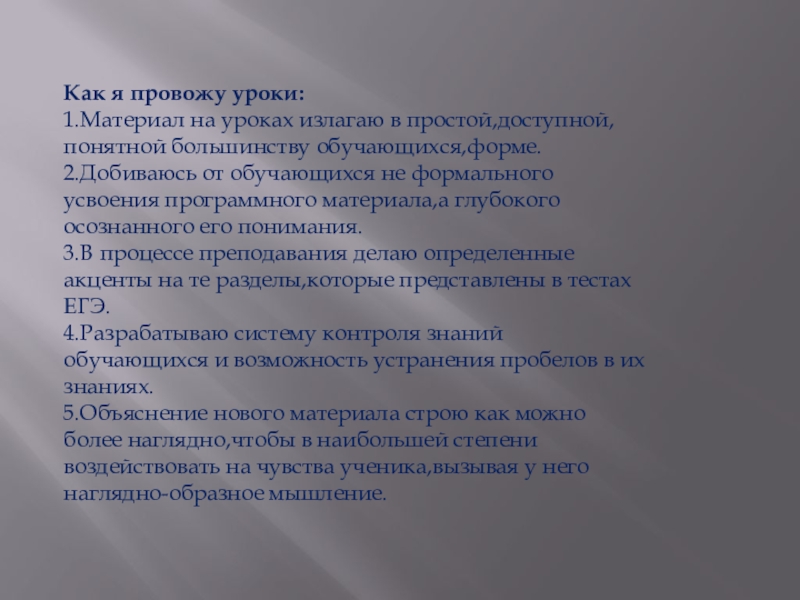 1.Материал на уроках излагаю в простой,доступной,понятной большинству обучающихся,форме.