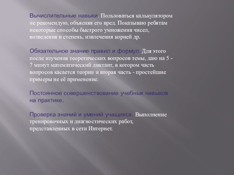 Слайд 7Вычислительные навыки. Пользоваться калькулятором не рекомендую, объясняя его вред. Показываю ребятам