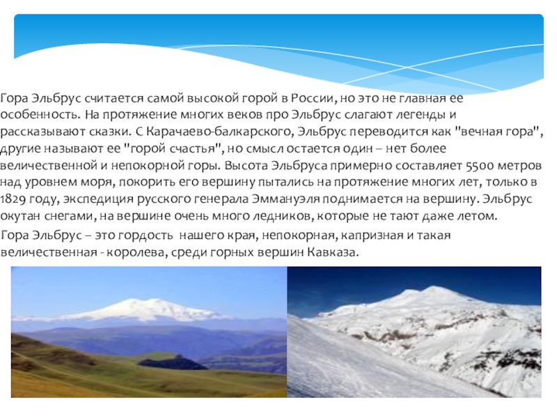 Гора Эльбрус – это гордость нашего края, непокорная, капризная и такая величественная - королева, среди горных вершин Кавказа.
