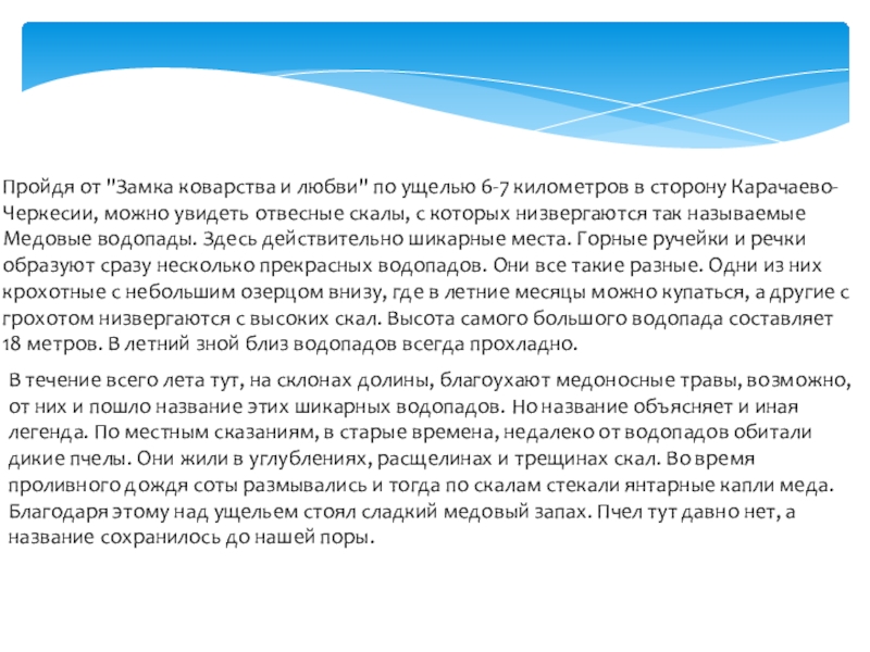 В течение всего лета тут, на склонах долины, благоухают медоносные травы, возможно, от них и пошло название этих шикарных водопадов. Но название объясняет и иная легенда. По местным сказаниям, в старые времена, недалеко от водопадов обитали дикие пчелы. Они жили в углублениях, расщелинах и трещинах скал. Во время проливного дождя соты размывались и тогда по скалам стекали янтарные капли меда. Благодаря этому над ущельем стоял сладкий медовый запах. Пчел тут давно нет, а название сохранилось до нашей поры.