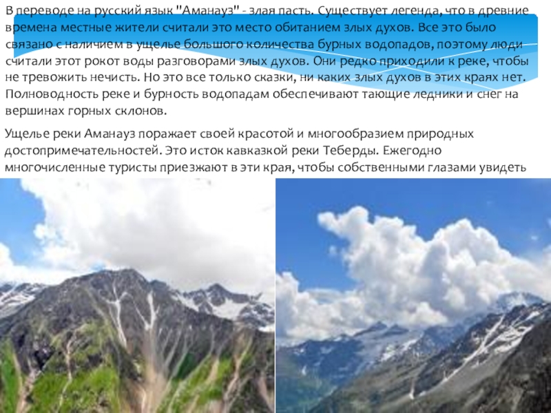 Ущелье реки Аманауз поражает своей красотой и многообразием природных достопримечательностей. Это исток кавказкой реки Теберды. Ежегодно многочисленные туристы приезжают в эти края, чтобы собственными глазами увидеть все это великолепие.