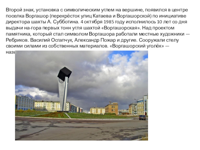 поселка Воргашор (перекрёсток улиц Катаева и Воргашорской) по инициативе директора шахты А. Субботина. 4 октября 1985 году исполнилось 10 лет со дня выдачи на-гора первых тонн угля шахтой «Воргашорская». Над проектом памятника, который стал символом Воргашора работали местные художники — Ребриков. Василий Осгапчук, Александр Пожар и другие. Сооружали стелу своими силами из собственных материалов. «Воргашорский уголёк» — называют жители поселка стелу-символ.